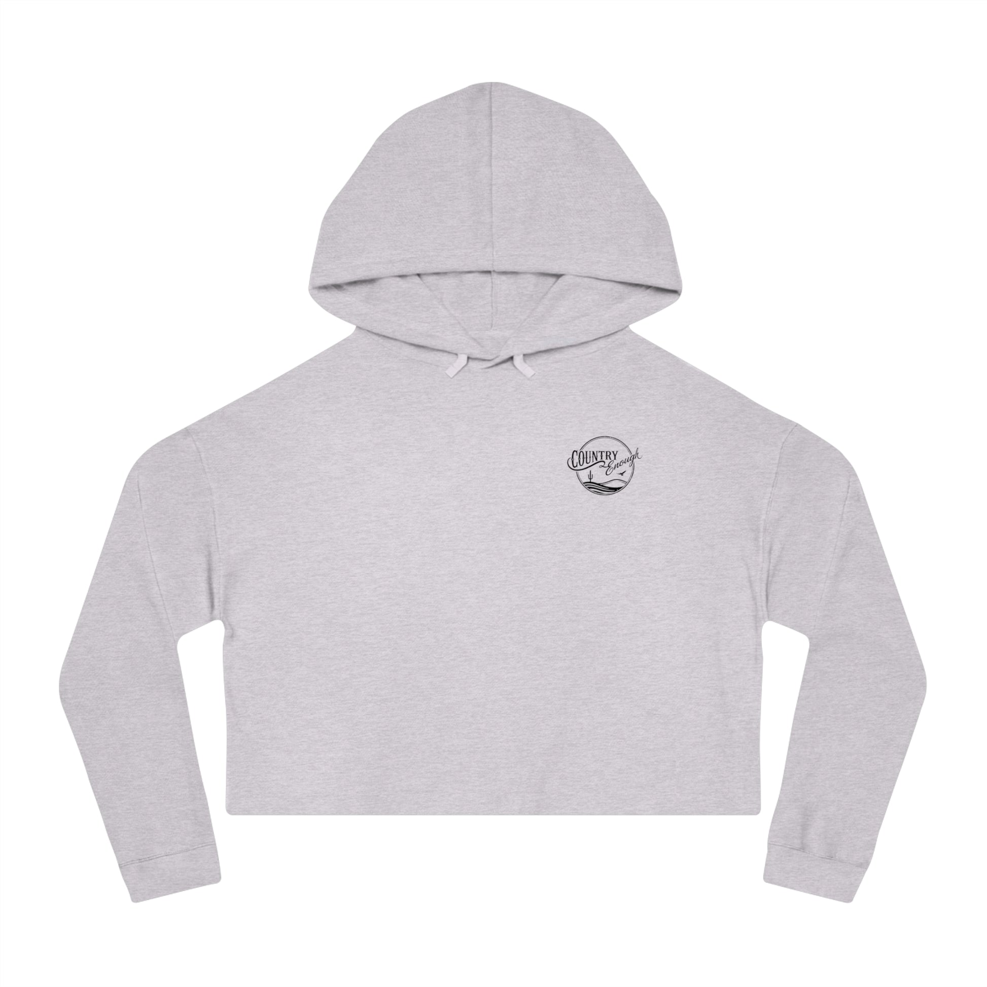 Show off your western pride with the Country Enough Crop Hoodie, the perfect blend of trendy comfort and rugged style. This fashionable women's hooded sweatshirt features a striking graphic that speaks to your authentic country soul, whether you're deep in the heartland or just country at heart. The hoodie's back is graced with a detailed, circular graphic that proudly declares "Country Enough". The design incorporates bold, distressed block lettering for "Country" and a contrasting, elegant script for "Enough," all encircled by a vintage, weathered border. The imagery inside the circle features a classic desert landscape, complete with a lone saguaro cactus and rolling, layered hills, topped off by the silhouette of a bird soaring over the horizon. The black-on-white graphic provides a high-contrast, eye-catching look that stands out on the crisp fabric. The hoodie itself boasts a modern cropped silhouette with an adjustable hood and long sleeves, making it an ideal layering piece. It’s perfect for cool summer nights, concert tailgates, or casual weekend wear. Pair it with high-waisted jeans, cutoff shorts, or a flowing skirt for an effortless look that proves you are, indeed, "Country Enough."